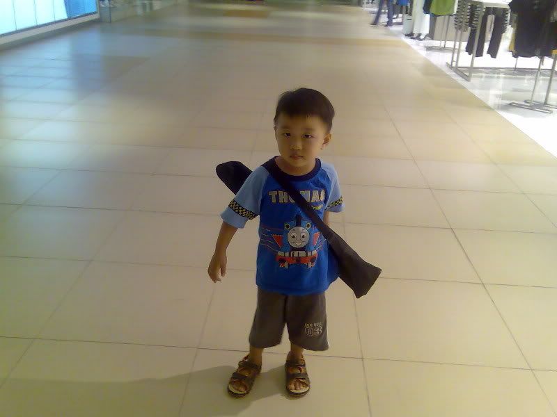 When the fireworks came, Hua-Yi and Uncle Chua (they decided to come along to see the fireworks too) brought the little fellow out to see it. It was awesome!! This year's fireworks is even better than the ones we had last year! And the little fellow had a great time ooh-haa-ing at the fireworks. When Peng Yi Yi came to meet us after the fireworks, the little fellow "volunteered" to carry her tripod and had a great time carrying the bag. We thought he looked cute pretending to be a swordsman and took a few pics of him....